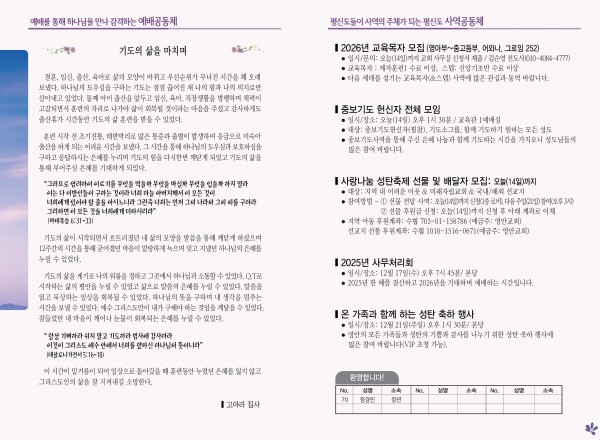 2025년 12월 14일 주보 페이지 정보 작성자 관리지기 작성일25-12-13 10:34 조회677회 댓글0건 관련링크 목록 본문 2025년 12월 14일 주보 댓글목록 등록된 댓글이 없습니다. 목록