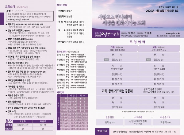 2026년 1월 18일 주보 페이지 정보 작성자 관리지기 작성일26-01-17 12:23 조회612회 댓글0건 관련링크 목록 본문 2026년 1월 18일 주보 댓글목록 등록된 댓글이 없습니다. 목록