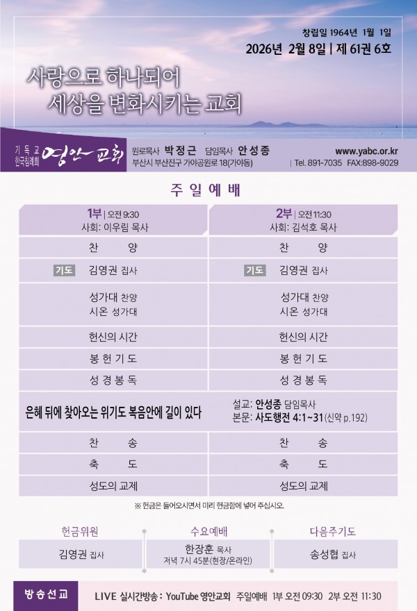 2026년 2월 8일 주보 페이지 정보 작성자 관리지기 작성일26-02-07 11:08 조회541회 댓글0건 관련링크 목록 본문 2026년 2월 8일 주보 댓글목록 등록된 댓글이 없습니다. 목록