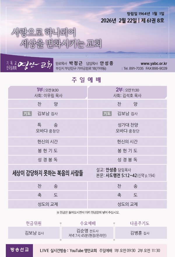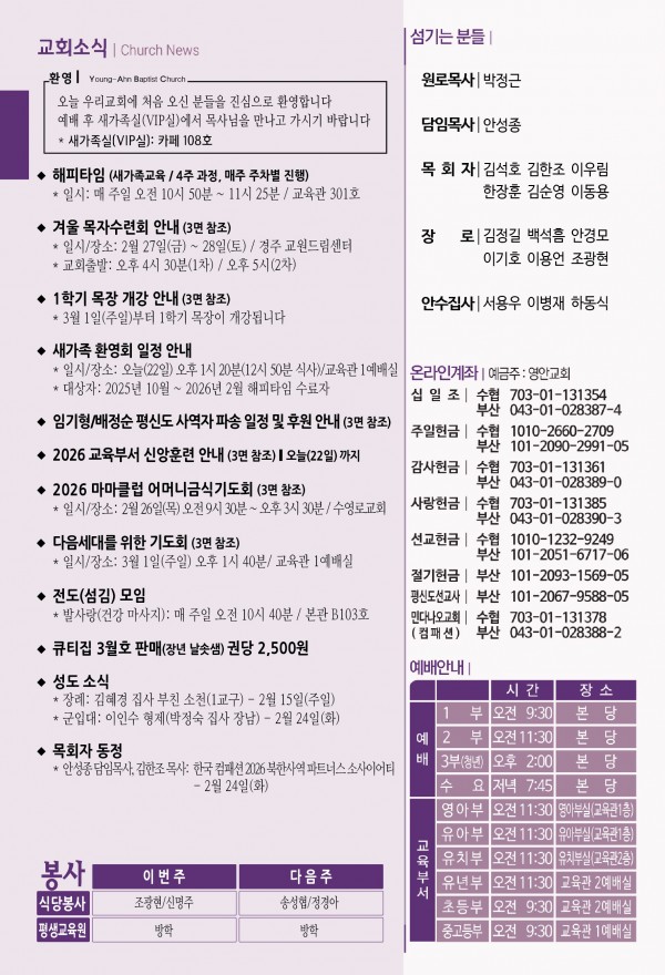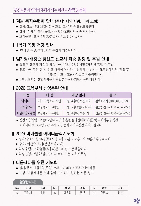 2026년 2월 22일 주보 페이지 정보 작성자 관리지기 작성일26-02-21 11:19 조회462회 댓글0건 관련링크 목록 본문 2026년 2월 22일 주보 댓글목록 등록된 댓글이 없습니다. 목록