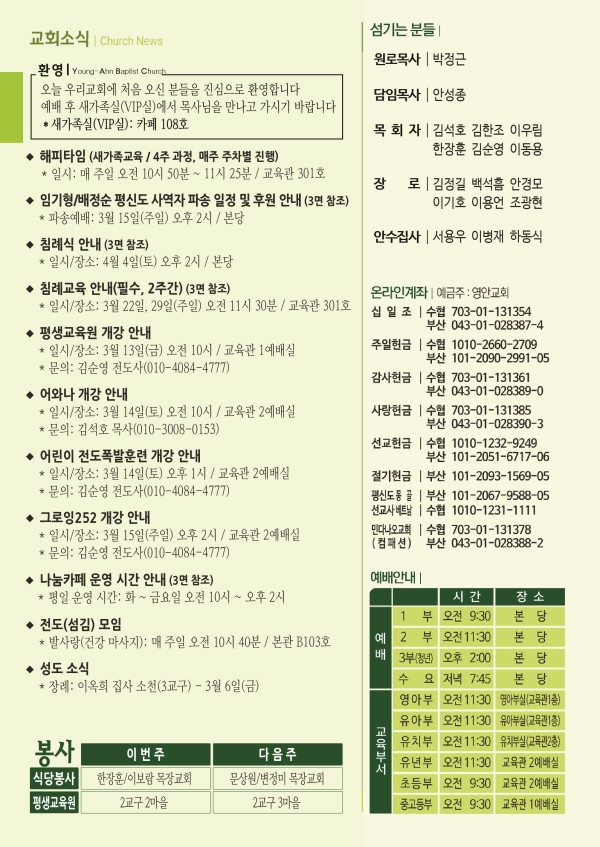 2026년 3월 8일 주보 페이지 정보 작성자 관리지기 작성일26-03-07 09:50 조회873회 댓글0건 관련링크 목록 본문 2026년 3월 8일 주보 댓글목록 등록된 댓글이 없습니다. 목록
