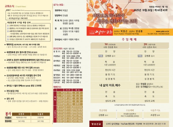 2025년 10월 26일 주보 페이지 정보 작성자 관리지기 작성일25-10-25 10:43 조회455회 댓글0건 관련링크 목록 본문 2025년 10월 26일 주보 댓글목록 등록된 댓글이 없습니다. 목록
