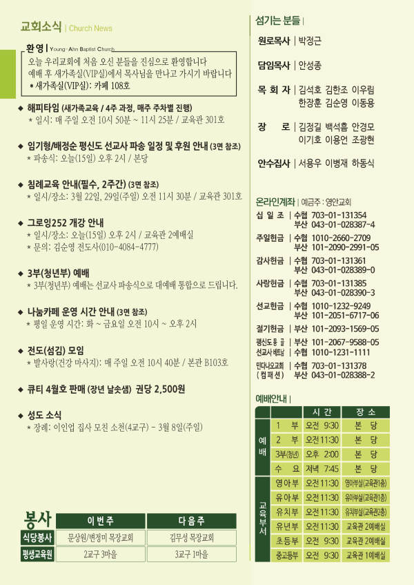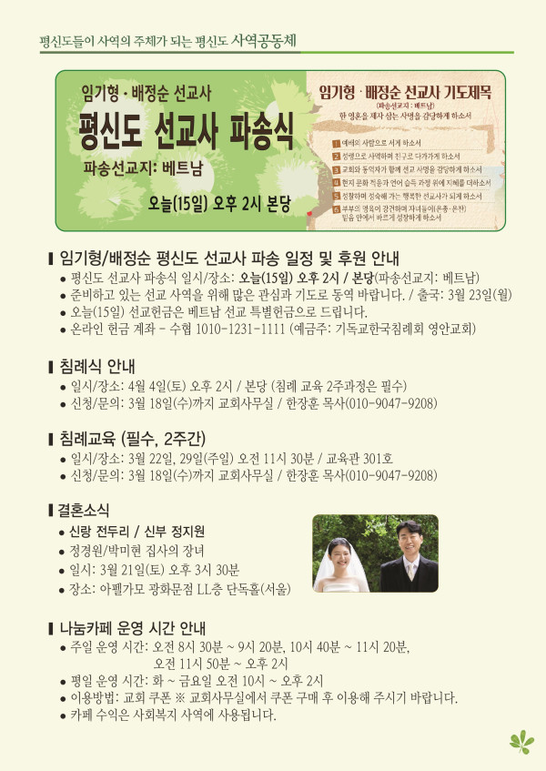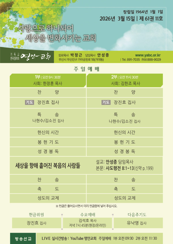 2026년 3월 15일 주보 페이지 정보 작성자 관리지기 작성일26-03-14 11:19 조회1,211회 댓글0건 관련링크 목록 본문 2026년 3월 15일 주보 댓글목록 등록된 댓글이 없습니다. 목록
