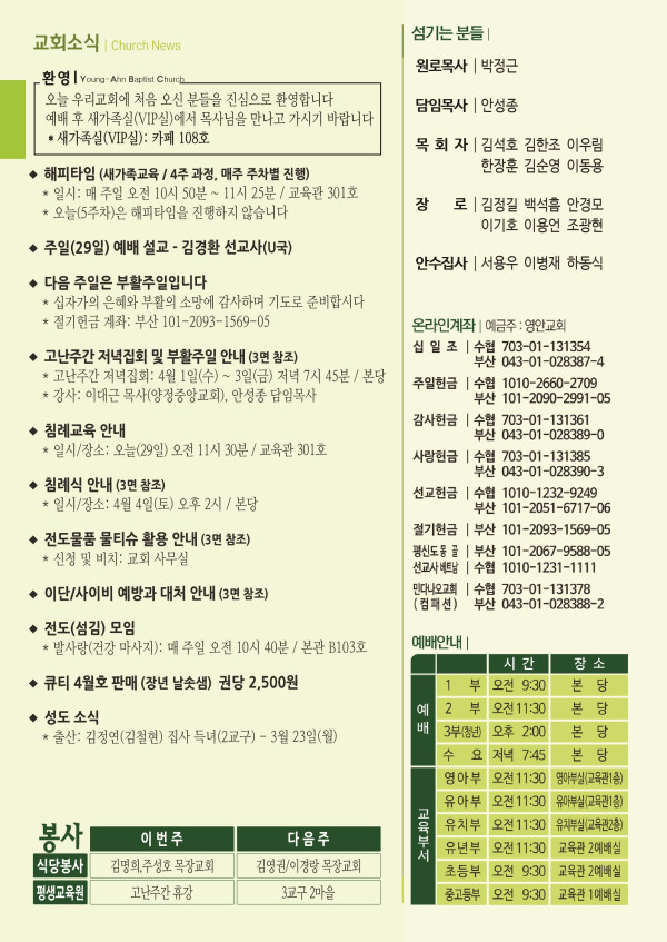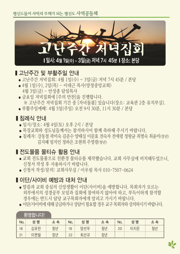 2026년 3월 29일 주보 페이지 정보 작성자 관리지기 작성일26-03-28 10:21 조회809회 댓글0건 관련링크 목록 본문 2026년 3월 29일 주보 댓글목록 등록된 댓글이 없습니다. 목록