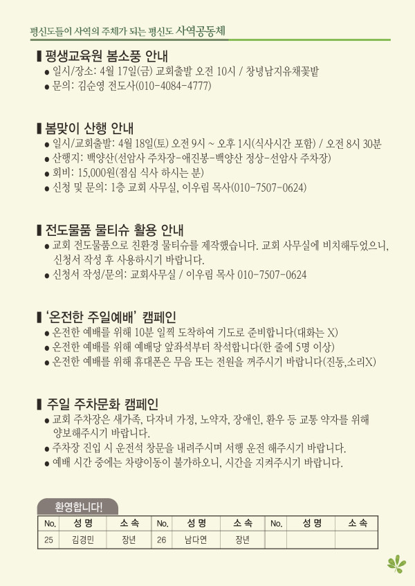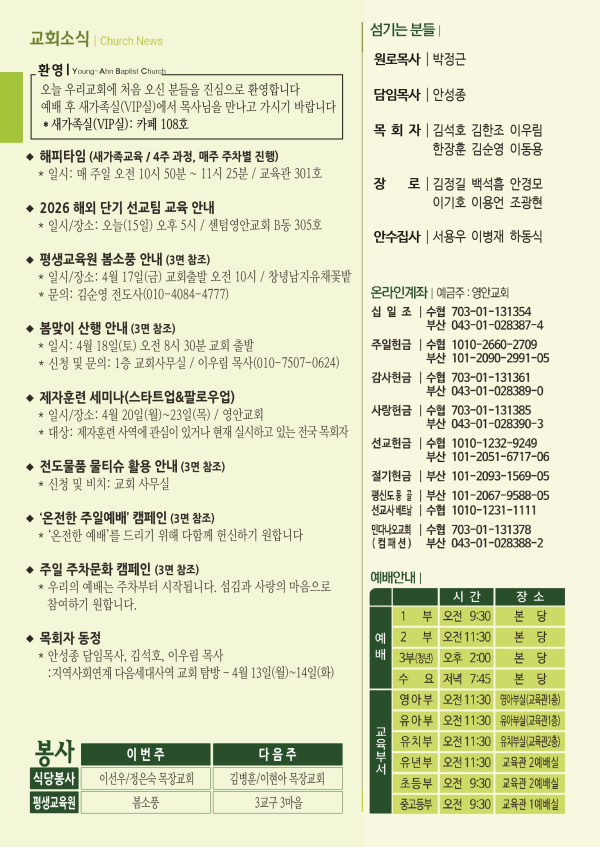 2026년 4월 12일 주보 페이지 정보 작성자 관리지기 작성일26-04-11 10:13 조회412회 댓글0건 관련링크 목록 본문 2026년 4월 12일 주보 댓글목록 등록된 댓글이 없습니다. 목록