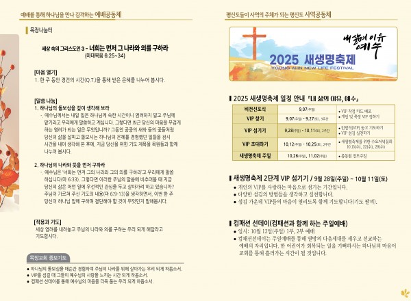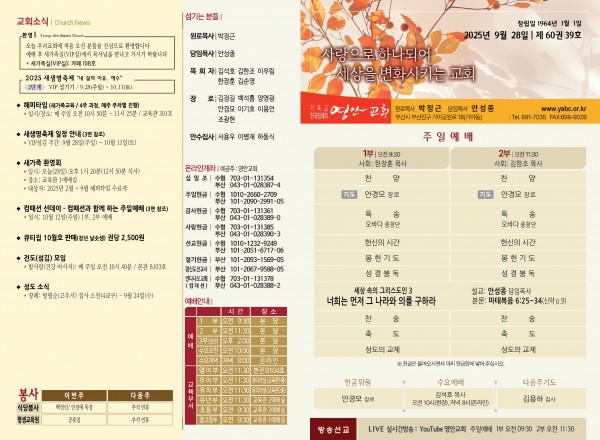2025년 9월 28일 주보 페이지 정보 작성자 관리지기 작성일25-09-27 10:23 조회905회 댓글0건 관련링크 목록 본문 2025년 9월 28일 주보 댓글목록 등록된 댓글이 없습니다. 목록