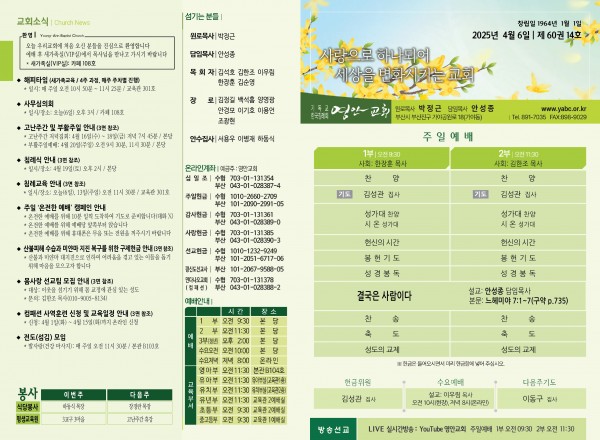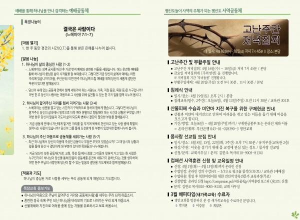 2025년 4월 6일 주보 페이지 정보 작성자 관리지기 작성일25-04-05 11:01 조회1,771회 댓글0건 관련링크 목록 본문 2025년 4월 6일 주보 댓글목록 등록된 댓글이 없습니다. 목록