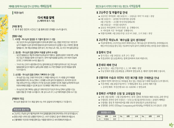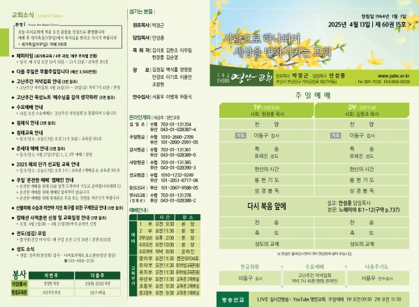 2025년 4월 13일 주보 페이지 정보 작성자 관리지기 작성일25-04-12 10:51 조회1,743회 댓글0건 관련링크 목록 본문 2025년 4월 13일 주보 댓글목록 등록된 댓글이 없습니다. 목록
