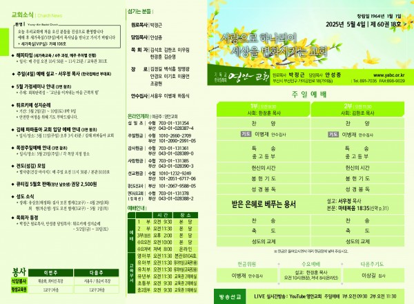 2025년 5월 4일 주보 페이지 정보 작성자 관리지기 작성일25-05-03 09:35 조회1,671회 댓글0건 관련링크 목록 본문 2025년 5월 4일 주보 댓글목록 등록된 댓글이 없습니다. 목록