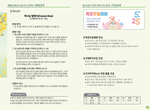 2025년 5월 18일 주보 페이지 정보 작성자 관리지기 작성일25-05-17 11:13 조회1,791회 댓글0건 관련링크 목록 본문 2025년 5월 18일 주보 댓글목록 등록된 댓글이 없습니다. 목록