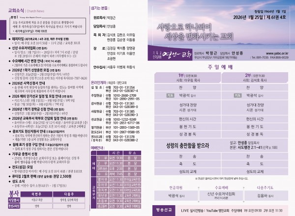 2026년 1월 25일 주보 페이지 정보 작성자 관리지기 작성일26-01-24 10:35 조회401회 댓글0건 관련링크 목록 본문 2026년 1월 25일 주보 댓글목록 등록된 댓글이 없습니다. 목록